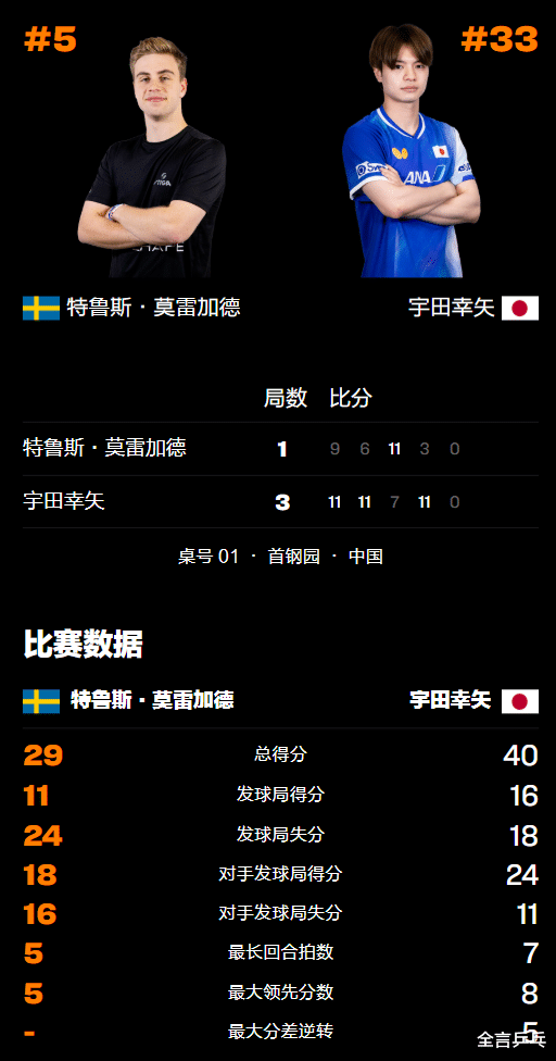 第二局莫雷加德更是中局便崩盘,迅速被拉开差距后以6-11再负,由此而大比分0-2落后,再输一局就将被淘汰。第三局背水一战的奥运亚军终于打出了自己的气势,近台发接发变化与线路调动成功破防,随即以11-7扳回一城。